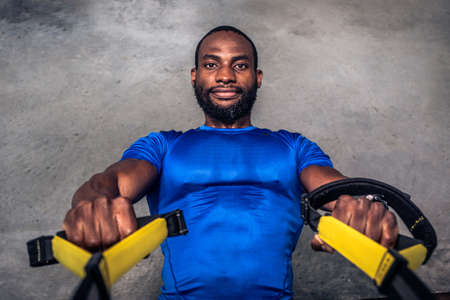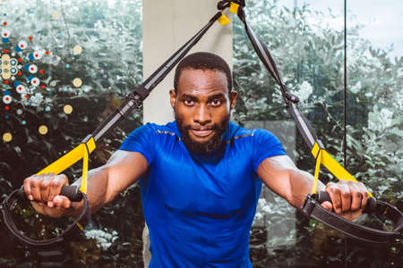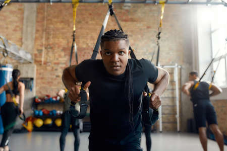 Determined beautiful slim body African woman with flat belly doing push-ups while exercising with suspension straps at gym. Healthy and active lifestyle, body care, fitness and sport concept