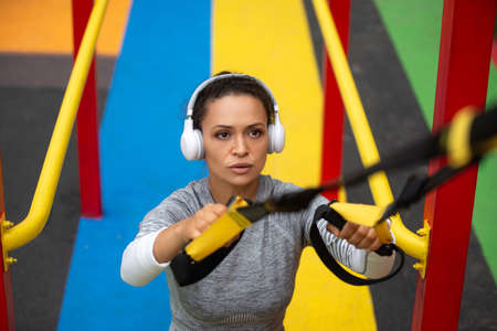 Young attractive woman doing upper body exercise training arms using trx suspension straps outdoor alone. The girl is engaged in sports against the background of metal parts.