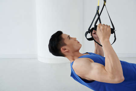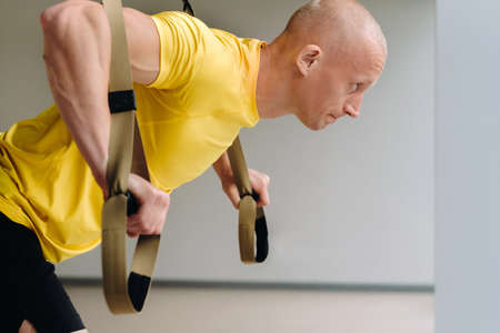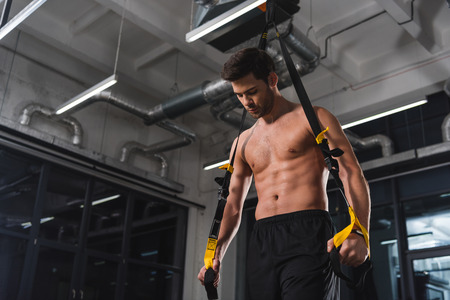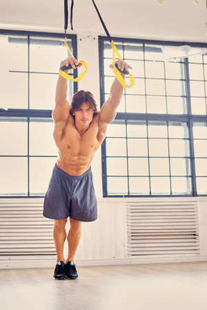 Muscular shirtless gymnast male doing workouts with suspension trx straps in a room.