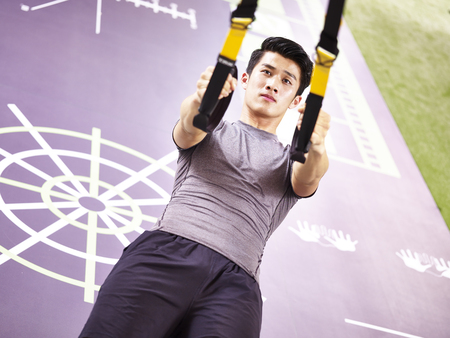 Asian female sportsperson exercising trx strap in fitness gym. Concept of bodybuilding and fitness.
