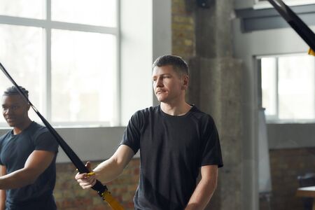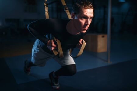 Movement Revolution. Portrait of caucasian man doing fitness TRX training exercises at industrial gym. Push-up, group workout concept