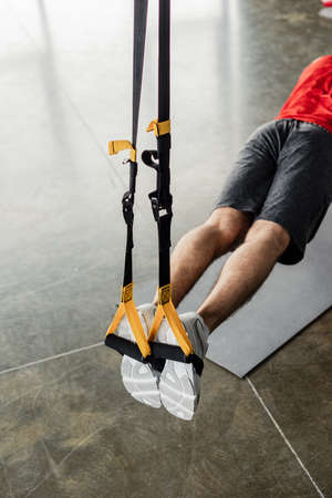 cropped image of tattooed athletic bodybuilder holding suspension straps in gym