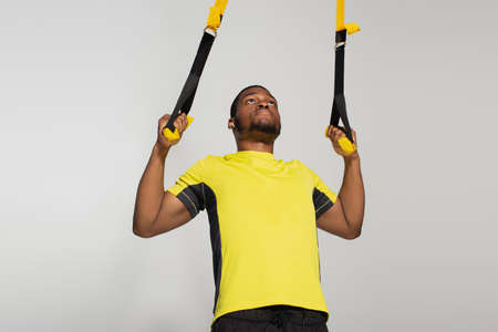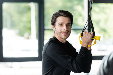 Smiling sportsman looking at camera while training with suspension straps in gym