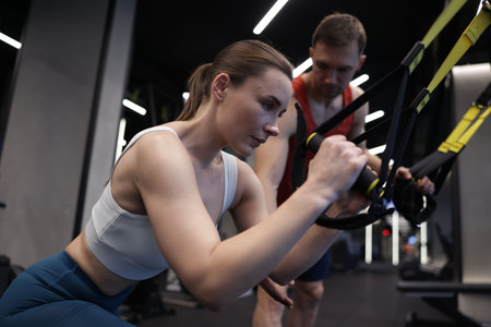 Young woman exercising with suspension trainers with professional personal coach in gym