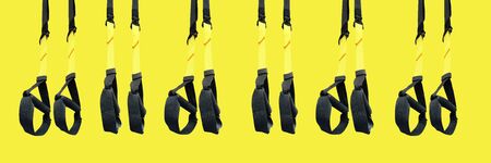 Black and yellow strap functional training equipment on grey background. Sport accessories. Fitness and Gym workout items for Healthy. Banner TRX