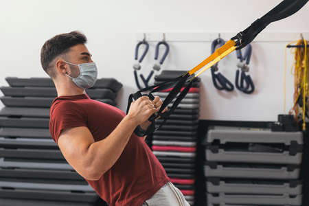 Afro american man training her arms with protective mask and straps Fitness in the gym during quarantine time for pandemic covid19