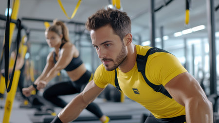Young woman and man training exercise push ups with fitness straps in the gym Concept sport workout healthy lifestyle