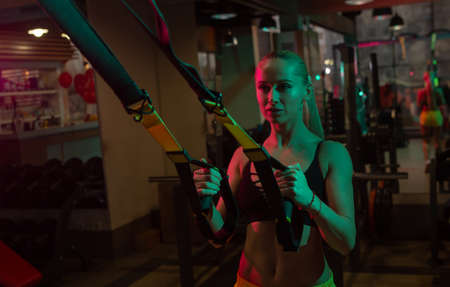 Fit woman in sportswear trains with cable resistance trx system in gym. Pink green neon light