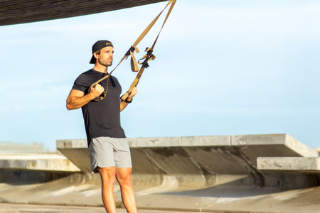 yound sporty athlete or bodybuilder has fitness workout with trx outdoor