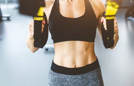 Women training with fitness straps in the gym. Beautiful lady exercising her muscles sling or suspension straps.