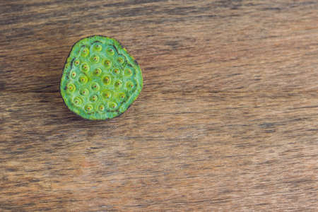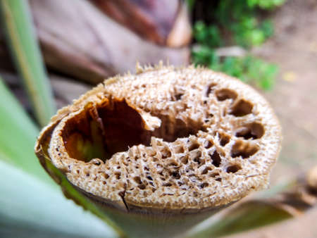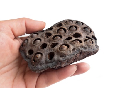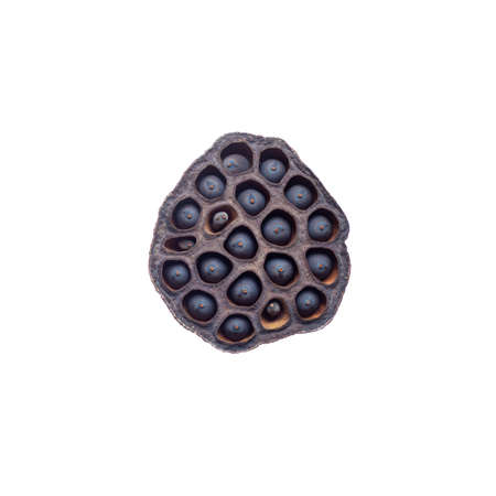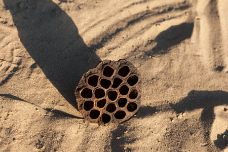 Dry seed head Lotus flower or Water lily on sand, close-up.