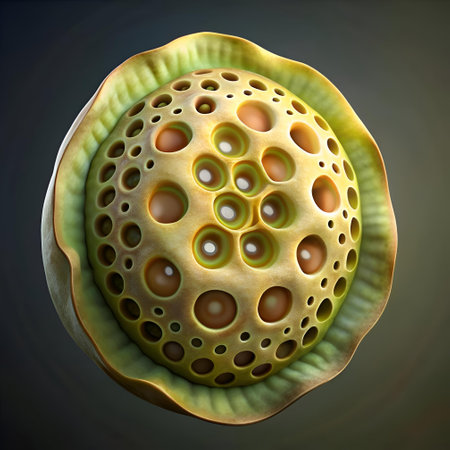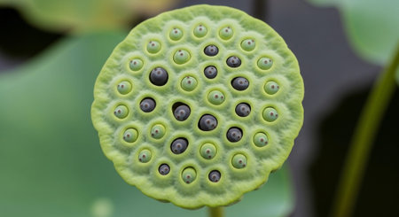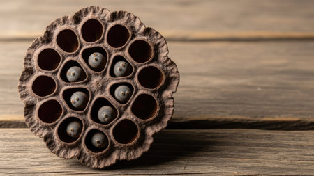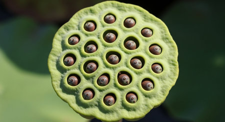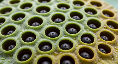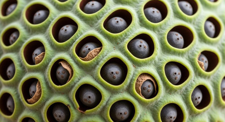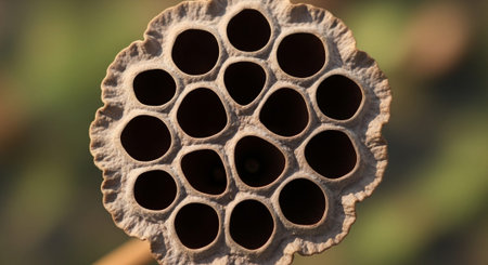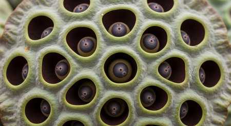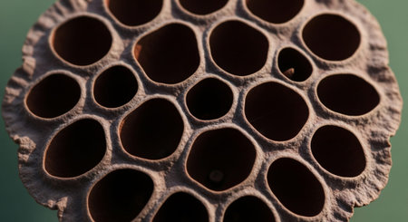 Close up of a lotus seed pod with intricate detail and a captivating texture. Perfect for botanical. nature. or design projects.