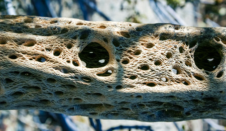 Close-up of fossilized coral with porous surface, displaying intricate patterns and textures. The coral structure reveals circular openings, showing natural beauty in detailed form