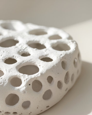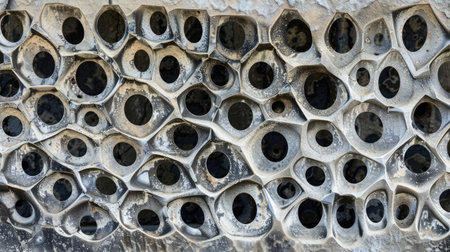 Unique texture of porous volcanic rock showcasing varied hole sizes against a bright background