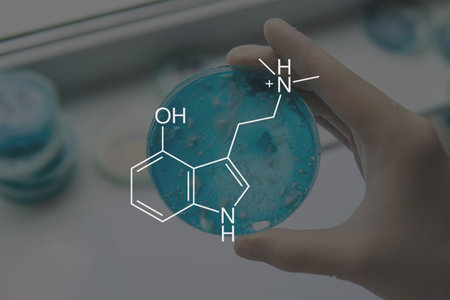Serotonin molecule, monoamine neurotransmitter, primarily found in the gastrointestinal tract, the central nervous system and blood platelets, 3D illustration. Serotonin is thought to affect mood and it is called happiness hormone