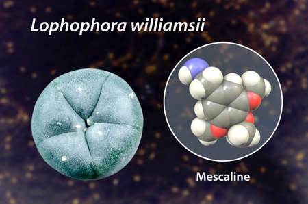 Mescaline molecule and its natural source, Mexican peyotl cactus (Lophophora williamsii), 3D illustration and photograph. Mescaline is a hallucinogenic substance present in the flesh of the cactus