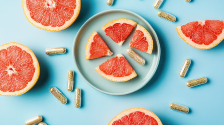 A vibrant arrangement of grapefruit slices on a plate surrounded by nutritional capsules, showcasing a mix of health and wellness themes in a colorful food composition.