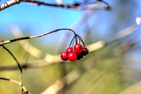 Red ripe fruits on guelder rose tree branch. Garden in village. Growing seasonal fruits, medicinal plants, agricultural concept