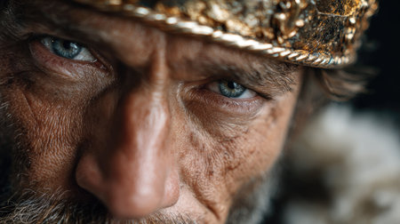 This stunning close-up portrait features a medieval warrior with a crown, showcasing intricate facial details that reflect strength, emotion, and resilience.