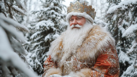 Dressed in a luxurious fur-lined cloak, a cheerful figure exudes warmth in a snowy woodland, capturing the essence of winter festivities. His presence invites joy and nostalgia.