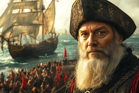 Vasco da Gama commands his crew aboard a wooden galleon as they approach the shores of Calicut. The scene captures the excitement and anticipation of their historic arrival.