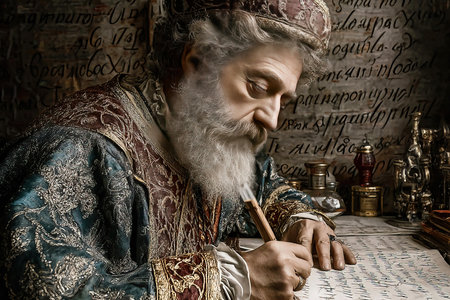 In a historical setting a scholarly figure resembling Claudius Ptolemy meticulously writes on a scroll surrounded by ancient texts and astronomical instruments.