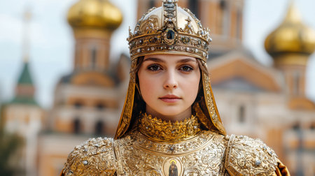 Majestic portrait of a bearded man in ornate golden crown for orthodox christmas themes.