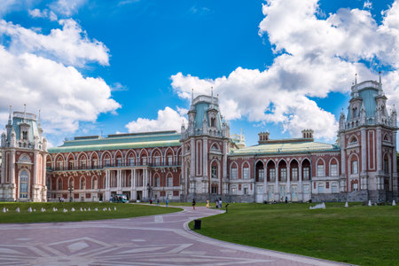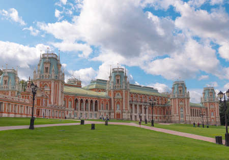 Tsaritsyno palace in Moscow, Russia. Brick historic building on the background of blue sky with white clouds in summer.