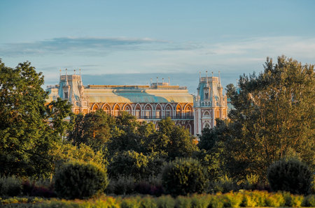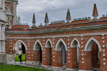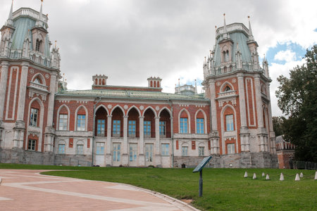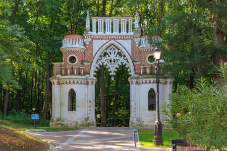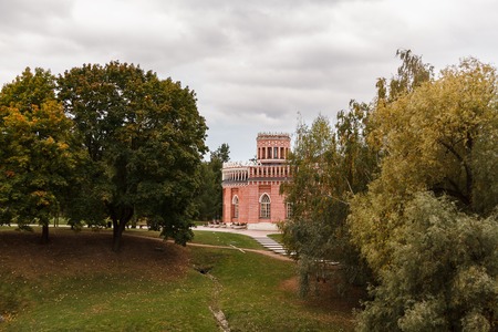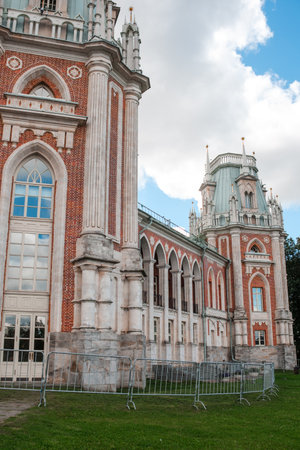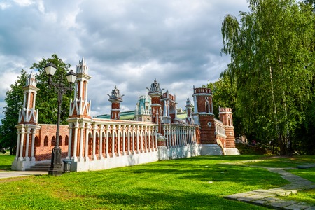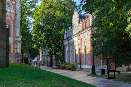 Moscow, Russia - September 5, 2020: Part of the architectural ensemble of the historical museum-estate Tsaritsyno. Fine example of the 18th century architecture and park landscaping