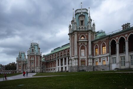 Moscow, Russia, 23 October 2019: Grand Palace, Tsaritsyno park. Evening landmark photo. Popular park Museum Tsaritsyno at sunset. Sightseeing Tsaritsyn Palace. Museum and park in the south of city