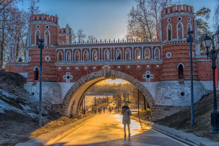 Russia, Moscow 05.04,2019 sunset, and the Figure bridge in Tsaritsyno