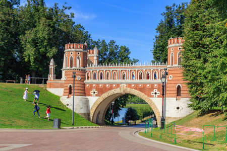 MOSCOW, RUSSIA - JUNE 16, 2018: Tourists on the bridge in the museum-reserve Tsaritsyno