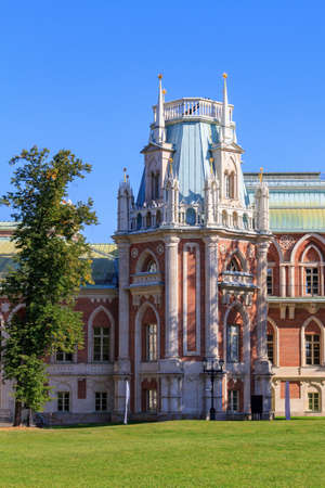 Moscow, Russia - August 12, 2018: Tower of Great Palace in Museum-reserve Tsaritsyno closeup on a background of blue sky and green lawn in sunny summer morning