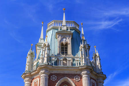Moscow, Russia - August 12, 2018: Tower with spires of Great Palace in Museum-reserve Tsaritsyno closeup against blue sky in sunny summer morning