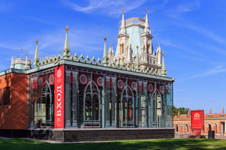 Moscow, Russia - August 12, 2018: Glass facade of pavilion above entrance to the Great Palace museum in Museum-reserve Tsaritsyno against blue sky on a sunny summer morning