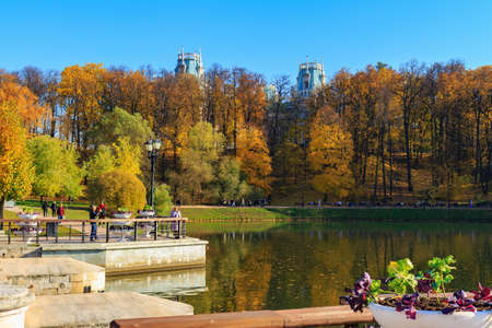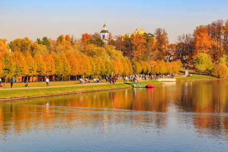 Moscow, Russia - October 17, 2018: People walking on the pond shore in Tsaritsyno park in Moscow at sunny autumn day