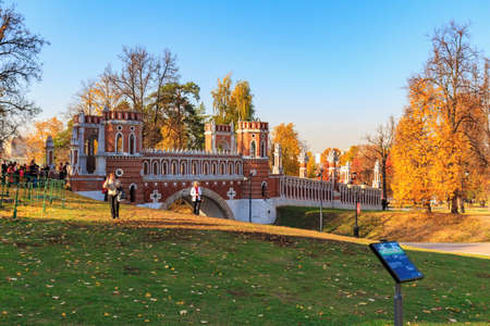 Moscow, Russia - October 17, 2018: Tourists walking near Figured bridge in Tsaritsyno park in Moscow at sunny autumn day