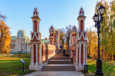 Russia. Shaped bridge in Tsaritsyn in Moscow on a clear autumn day. Tsaritsyn Park is one of the main tourist attractions in Moscow.