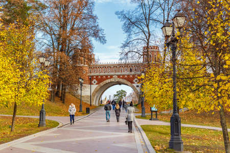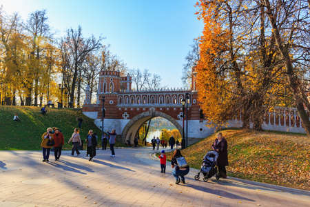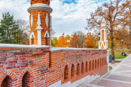 Moscow, Russia - October 17, 2018: People walking on footpath against Figured bridge in Tsaritsyno park in Moscow at sunny autumn day