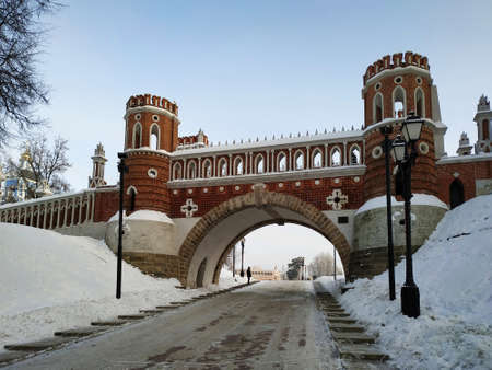 Moscow, Russia - December 17, 2018: Figured bridge in Tsaritsyno park in Moscow at sunny winter day
