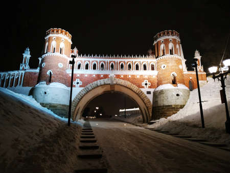 Moscow, Russia - December 17, 2018: Grand palace in Tsaritsyno park in Moscow at winter night
