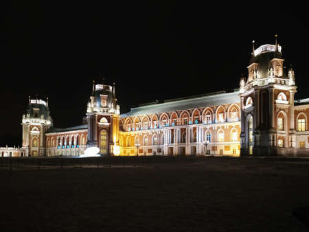 Moscow, Russia - December 17, 2018: Grand palace with light decorations in Tsaritsyno park at Moscow winter night