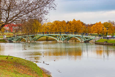 Moscow, Russia - October 16, 2019: Tsaritsyno Park in autumn. View of pedestrian bridge above pond against autumn trees with colored leaves in cloudy autumn day