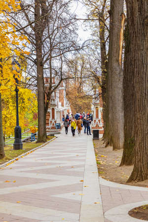 Moscow, Russia - October 16, 2019: Group of tourists walking on alley to the Figured Bridge in Tsaritsyno Park in Moscow at autumn day. Tsaritsyno Park is popular touristic place in Moscow