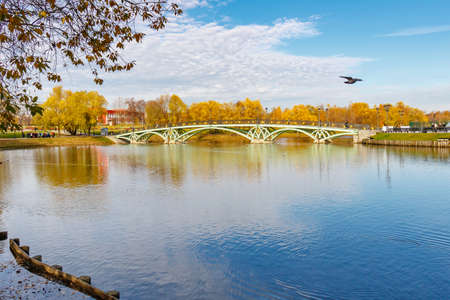 Moscow, Russia - October 16, 2019: Water surface of pond and bridge to the island in Tsaritsyno Park in Moscow against blue sky at sunny autumn day. City park landscape