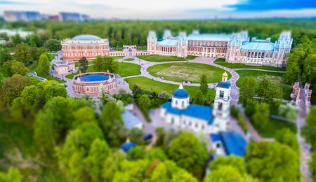 TSARITSYNO PALACE, RUSSIA - MAY 22, 2017. Tsaritsyno Museum in Moscow. Aerial view. Top view. Tilt-shift effect applied.