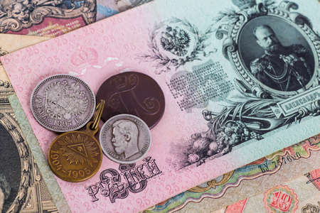 Gold and silver coins of the Russian Empire in the background kopyur.Antikvariat.