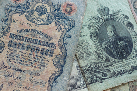 Vintage background, old Russian money (State credit card). Portrait of Alexander III