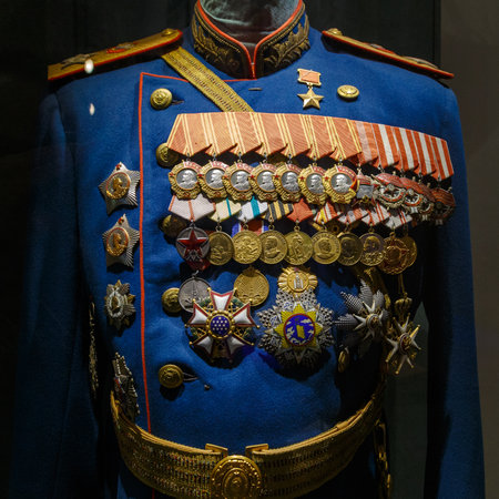 Moscow, Russia - January 23, 2019: Central Armed Forces Museum. Different awards, orders and medals on the russian army soldier uniform