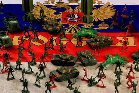 Toy soldiers and army armor, ballistic missiles on the background of the Russian flag